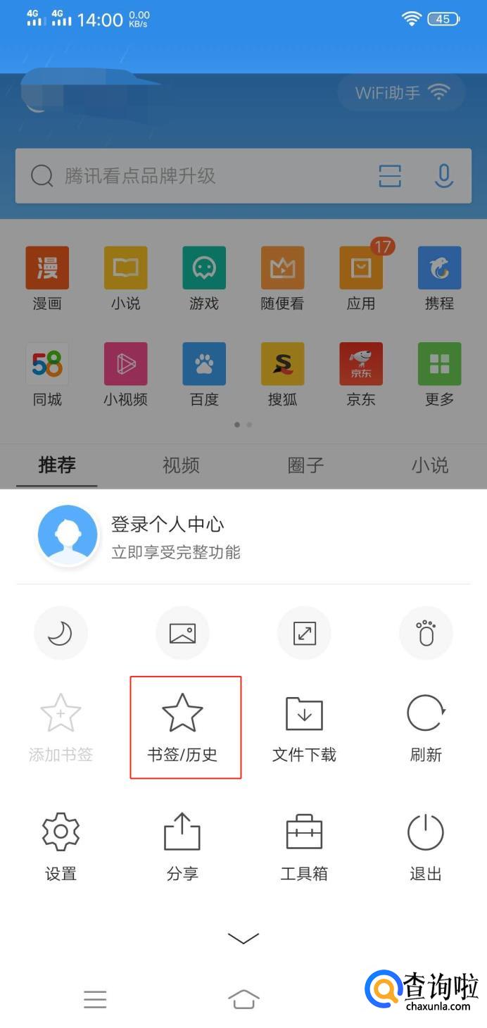 点击主菜单按钮之后会弹出一个菜单,点击“书签/历史”。