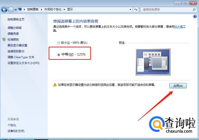 在根据实际情况选择桌面图标的显示比例,在点击【应用】即可。