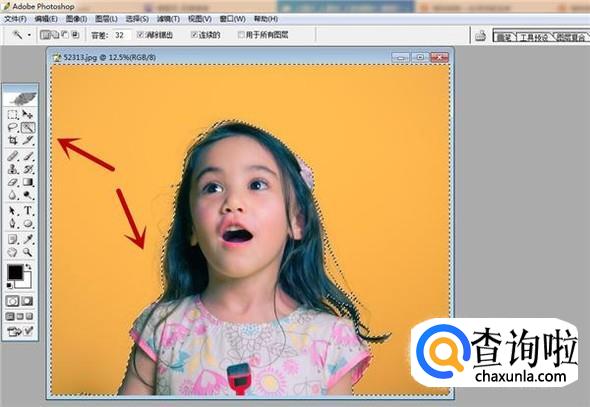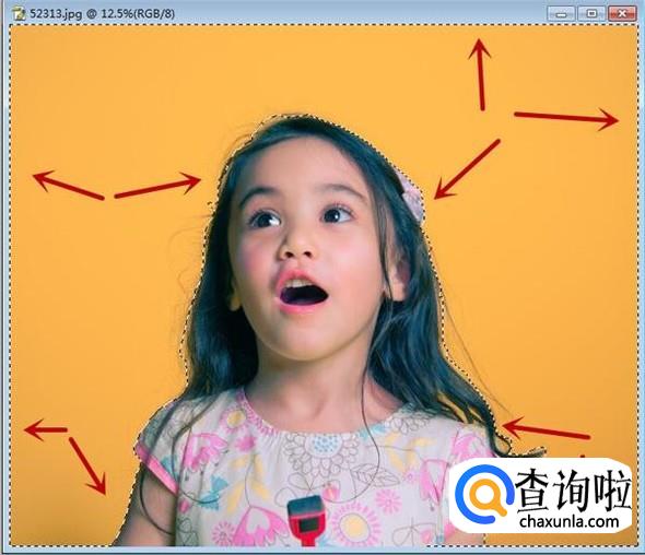 之后我们在黄色的区域,也就是非抠图区域点击,即可将区域选中,我们同样按住Shift进行增加选区,按住Alt减少选区,如图所示。