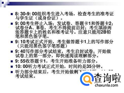 正式考试时间为九点,九点前有一段试音时间,戴上耳机开始听有无故障,如有向老师报告。 作文在9:10- 9:40时间段内作答,一定要注意审题!然后是15分钟的快速阅读,9:55-10:00收答题卡。听力时间为30分钟,时间段为10:00-10:35,然后的时间就是写阅读题,完形填空题和翻译了。11.20收卷。