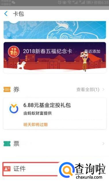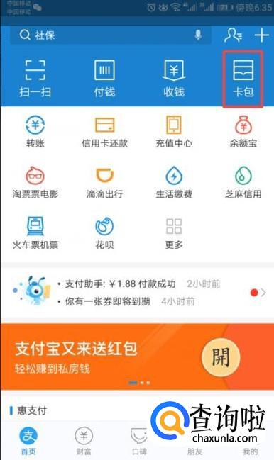 首先,我们打开我们的支付宝,然后我们点击卡包;
