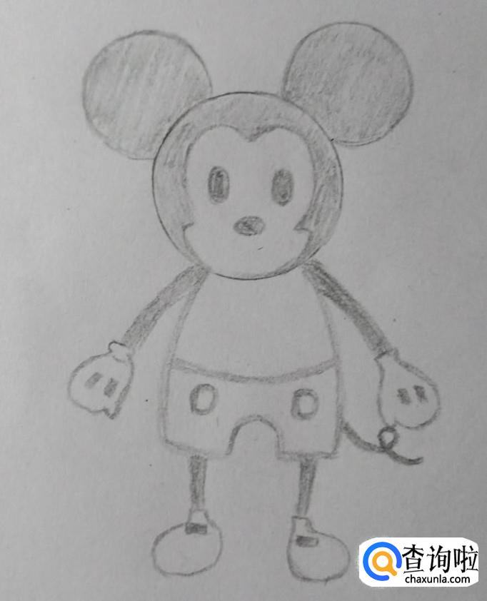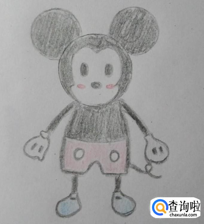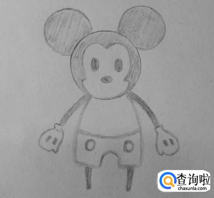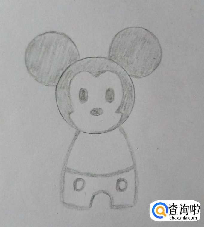 紧接着是米奇的身体,身体与头部大小比例相当,并画上米奇的裤子。