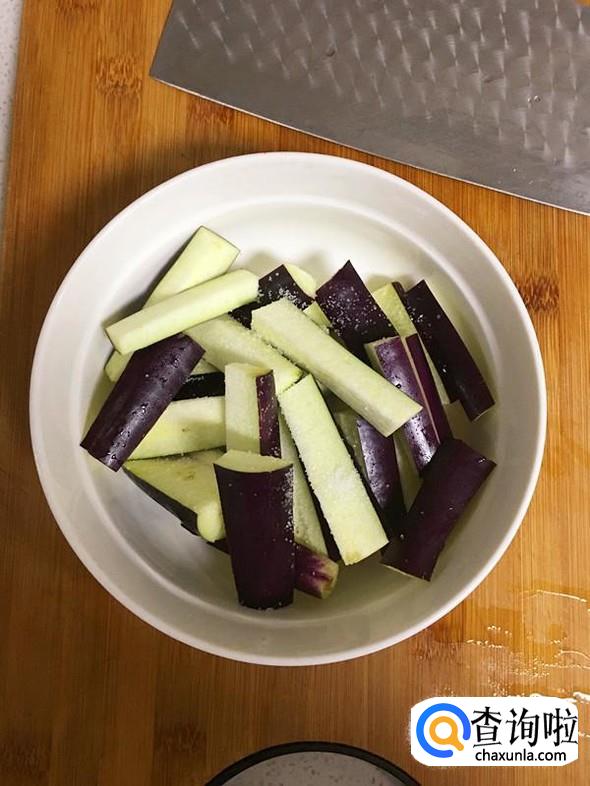 茄子用清水冲洗干净后,切成细长条,并均匀地撒上1小勺盐,然后静置2-3分钟。