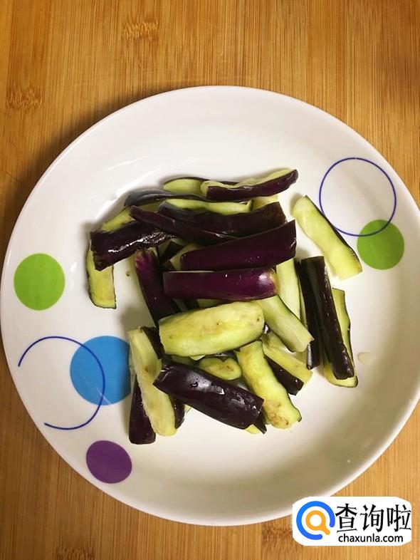 当茄条有些出水时,控干其中的水分,这样炒制的时候,茄子就不会吃油了。