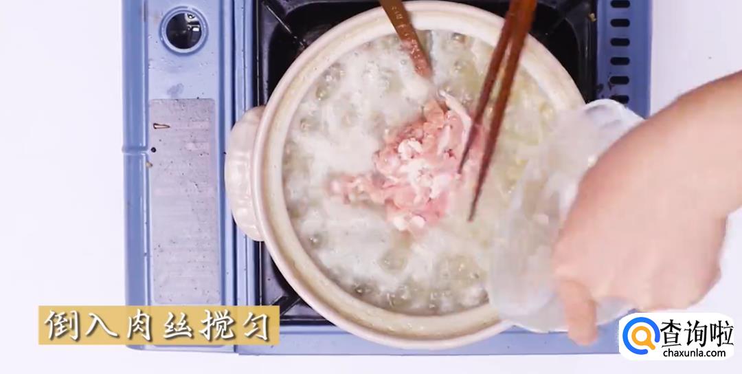 接着,把切好的肉丝倒进去,和大米、皮蛋一起搅拌均匀。