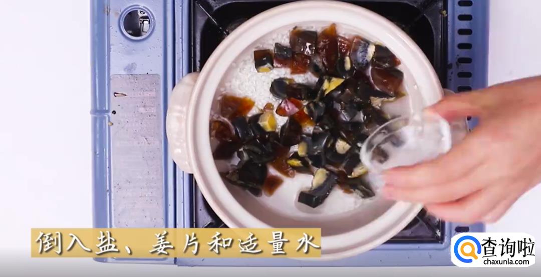 准备一口锅,将泡好的大米下进去,再倒入切好的皮蛋丁,加盐、姜片和适量清水,盖上锅盖焖煮一会。
