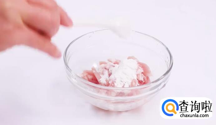 接着,将准备好的瘦肉切成肉丝状,再加入料酒、盐和淀粉,一起搅拌均匀。