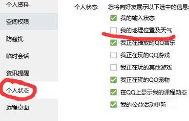 然后选择“权限设置”里面的“个人状态”,取消“我的地理位置和天气”这个选项即可。