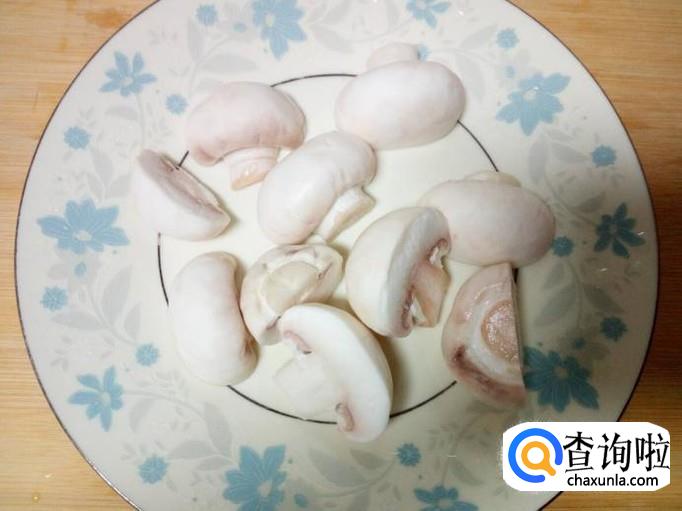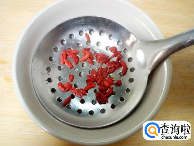 口蘑用水清洗干净,控干水分,切成对半。枸杞用水冲洗干净,控干水分。