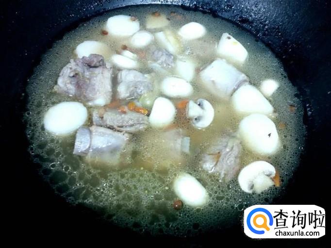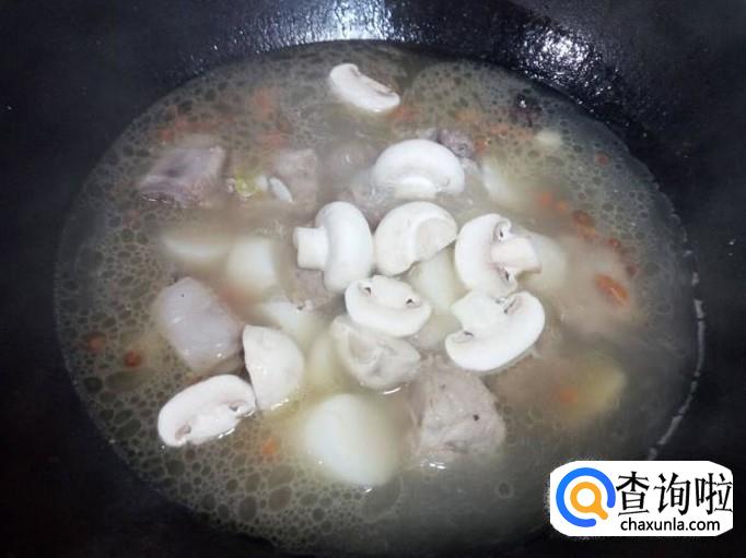 放入山药,再炖至10分钟的时间后,放入口蘑,转大火烧开,再转小火慢炖。放入口蘑后,再炖至5分钟的时间,放入少许味精,关火即可。