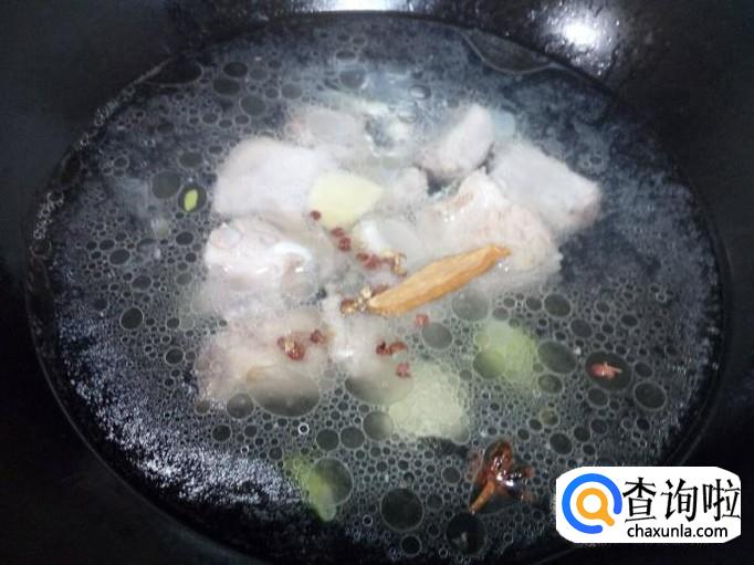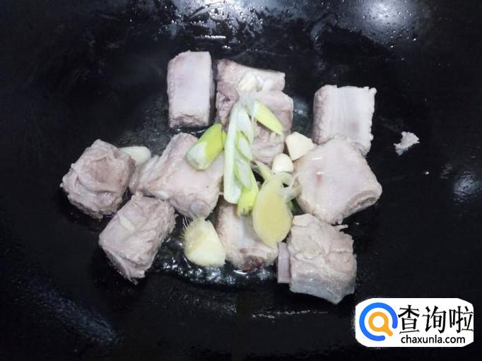 锅里放入少量的油加热,油热后放入排骨翻炒,放入葱,姜,蒜,料酒,少许醋,翻炒。翻炒一分钟的时间,然后放入水,水没过排骨,放入花椒,八角,桂皮,少许白糖,大火烧开转小火慢炖。