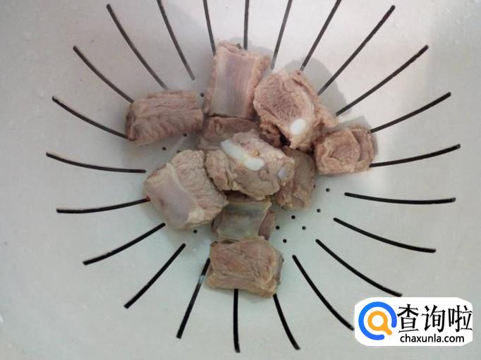 排骨放入冷水锅中烧开,水开后煮一分钟的时间捞出,用水冲洗掉上面的血水和沫子,沥干水分。