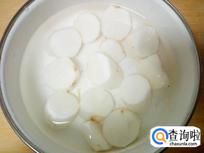 山药去皮,用水清洗干净,控干水分,切成块。放入水中浸泡,下锅之前,再用水投洗干净,控干水分。