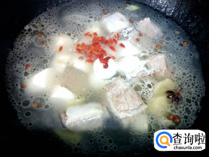 炖至30分钟左右的时间,放入山药,枸杞,盐,转大火烧开,再转小火慢炖。
