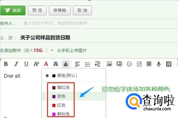 其次邮件正文的字体也不要太随意,中国人普遍比较严肃,所以邮件这种正规的沟通方式里,切勿使用那些看上去调皮的字体或者乱用各种颜色,一般来说使用黑体最合适,