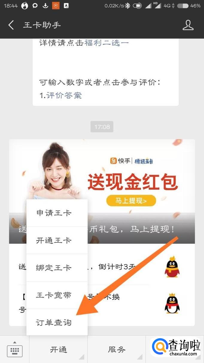 关注王卡助手,然后在下面的菜单栏里面点击“开通”,在子菜单里面点击“订单查询”。
