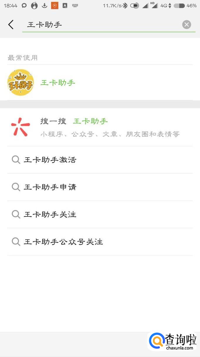 首先打开微信,点击上方的搜索图标,在输入框里面输入“王卡助手”。