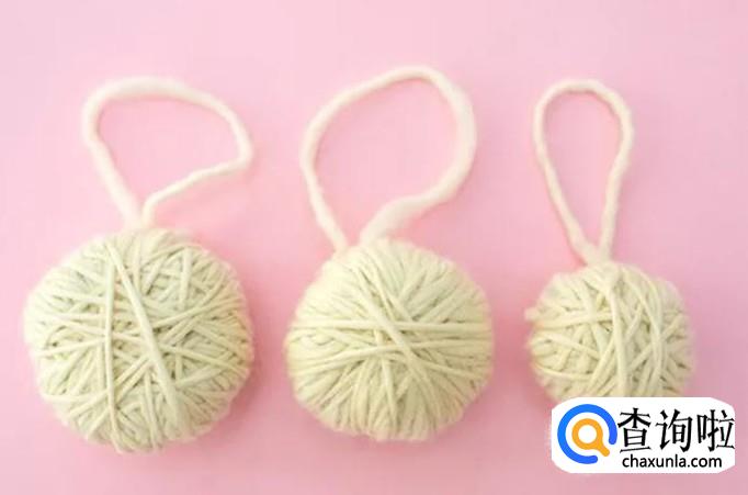 缠到中间,将线留出一段,打个结,作为挂绳,再接着把线头压住往下缠。缠成大小不一的线团,把最后的线头压塞进去。