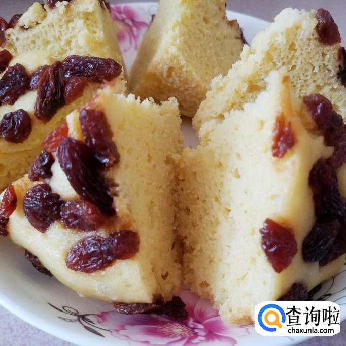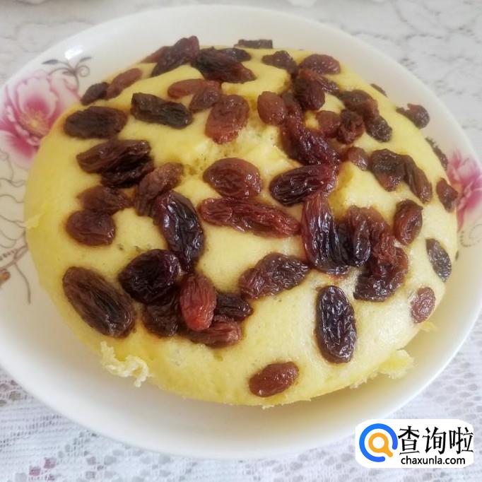将面糊倒入不锈钢盆中,轻轻震动出气泡,撒上葡萄干,蒸锅中放入凉水,放上面糊,盖上盖中火烧开。
