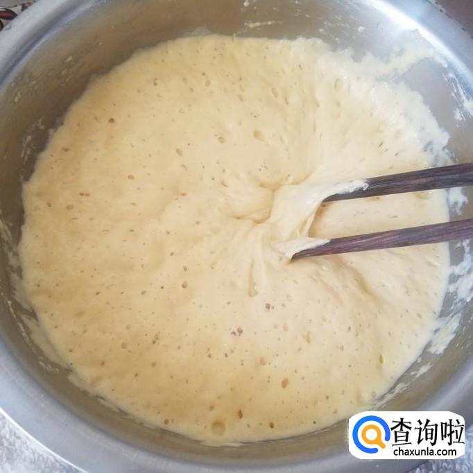 当面糊发酵出气泡,体积是原面糊一倍大时,面糊就发酵好了,搅拌出气泡。