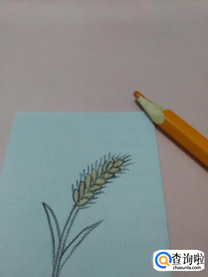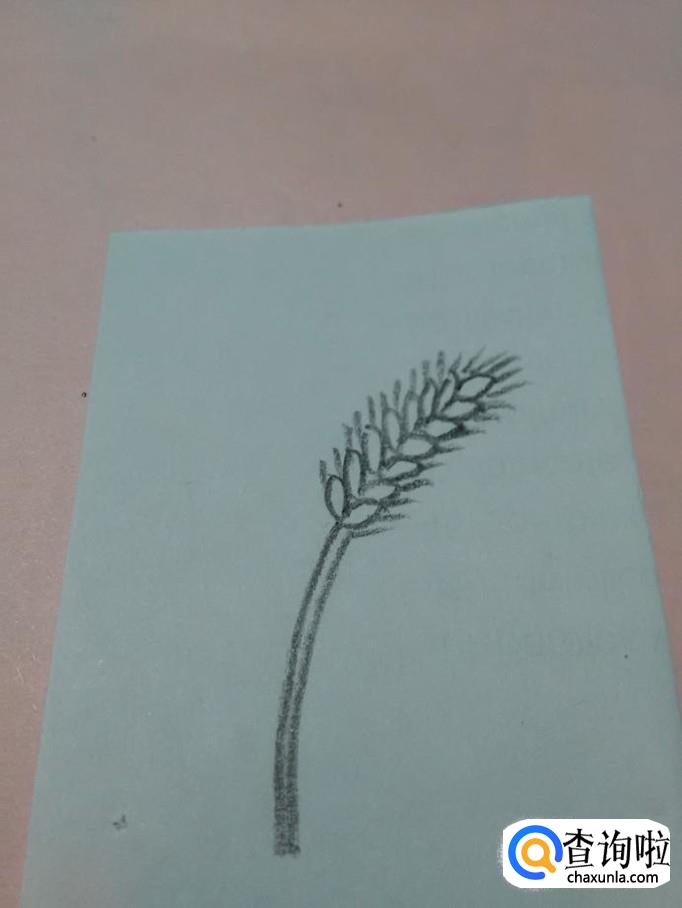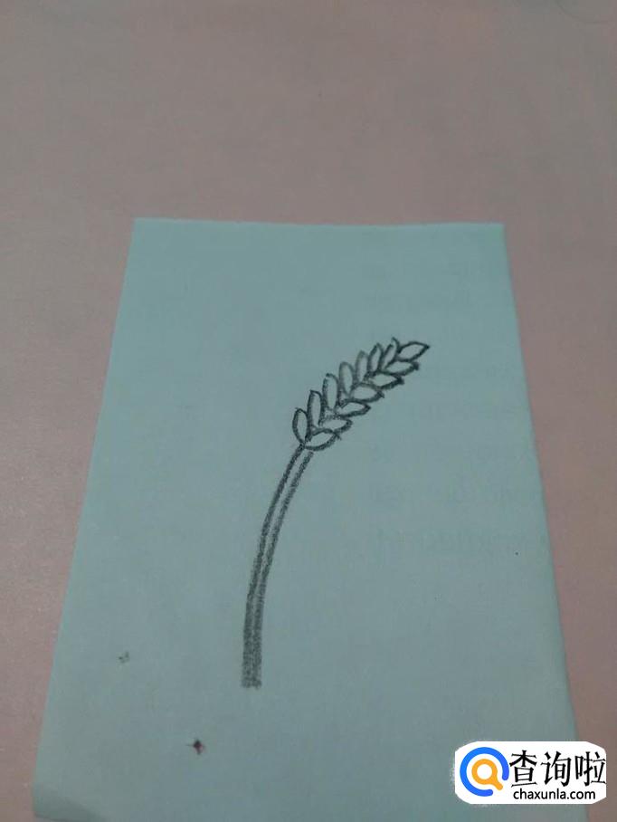 在麦杆的两侧,各画两条相交的弧线,表示叶子,到此,线条就画完了。