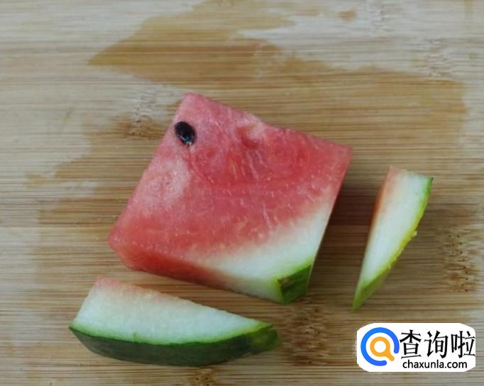 接下来直接拿出来一块西瓜,然后把西瓜的皮最边上分开切开,只要中间留下一点可以用手拿就行,这样吃起来也比较方便。