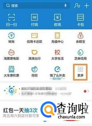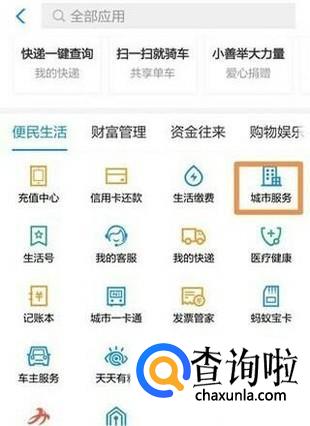 打开手机支付宝,在首页点击“更多”,进去之后点击便民生活中的“城市服务”。