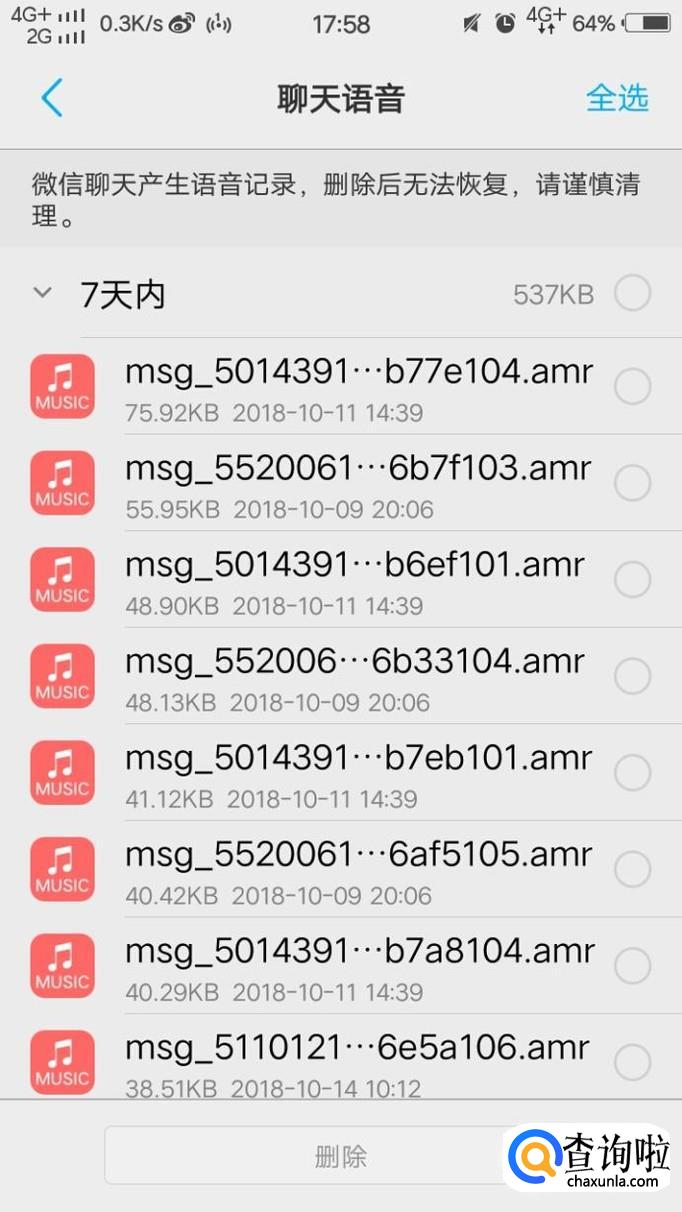 最后我们点击深度清理就可以看到微信里面所包含的内容,我们点击聊天,语音里面就会出现语音聊天记录,我们点击它即可播放。