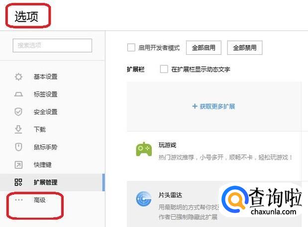 出现了一个新窗口“选项”,可以在其内对浏览器进行设置和管理。我们点击左侧栏里的“高级”按钮。