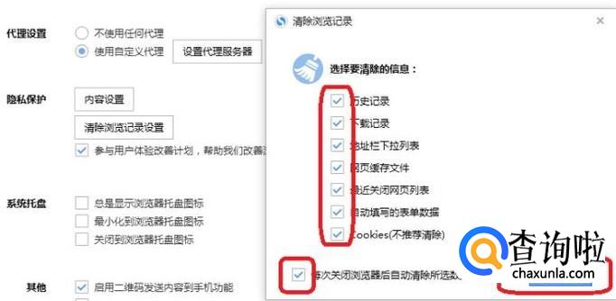 弹出“清除浏览记录”选项框,我们勾选全部要清除的信息,并勾选底部“每次关闭浏览器自动清除所选数据”,点击“立即清除”。以后再用搜狗浏览器上网就不用担心留下痕迹了。