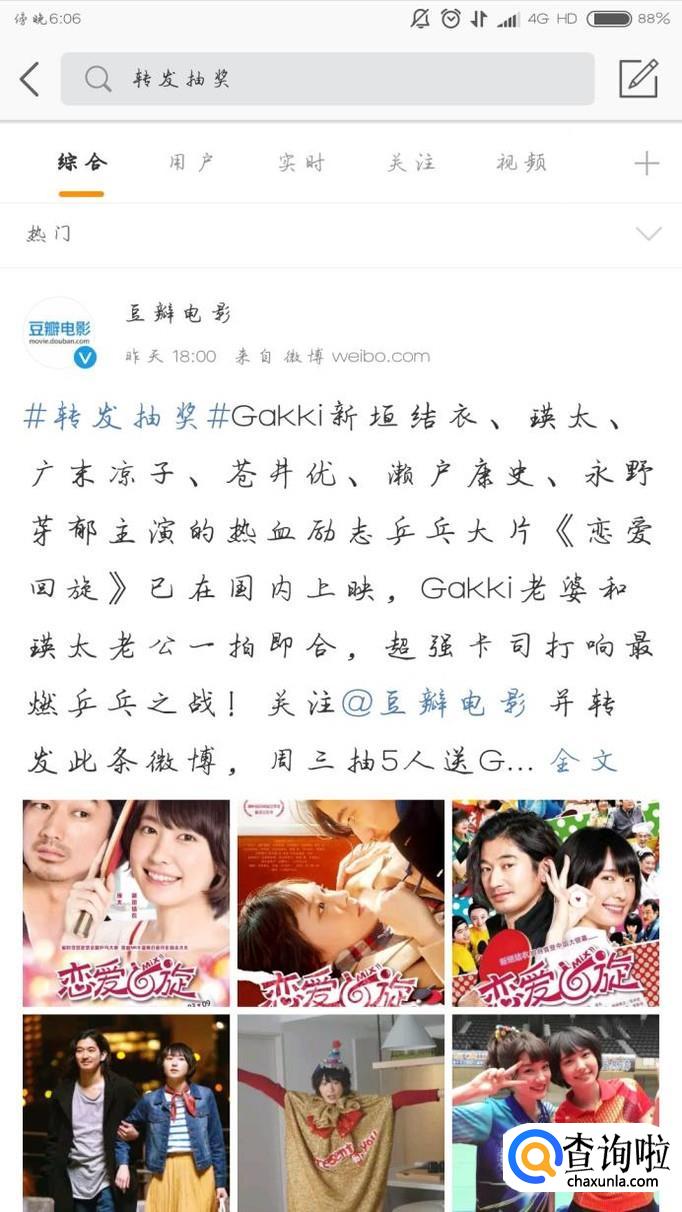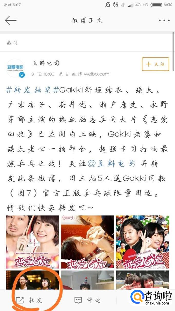 打开微博,找到有提示转发微博参与抽奖的微博内容