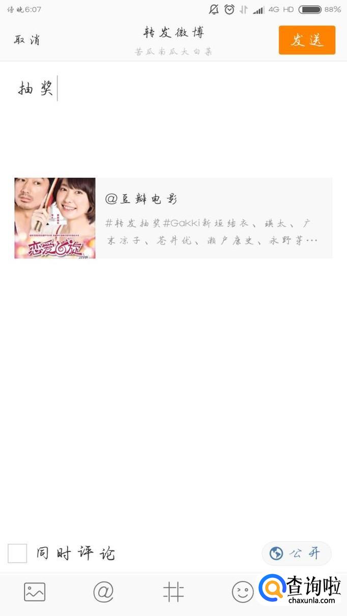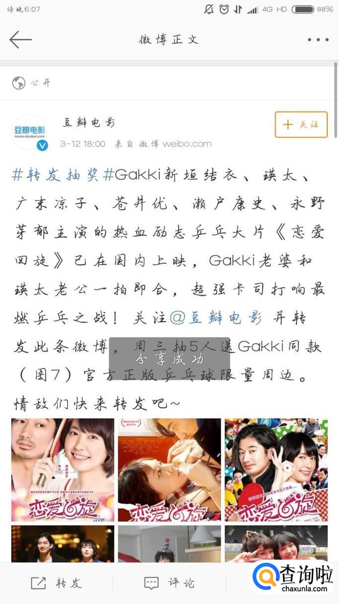 发送之后会出现“分享成功”的页面,并且你能够在自己的主页查看,然后你等着抽奖就可以了