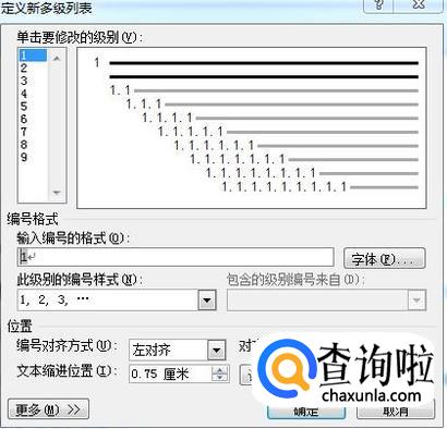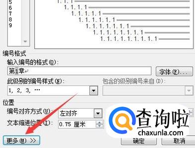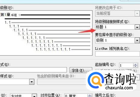 输入好后点击左下方的更多选项进行设置,在弹出的界面里找到“将级别链接到样式”的字样,然后在下方的选择条里选择标题1,设置好后点击确定。