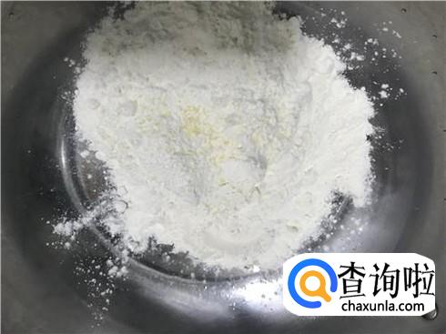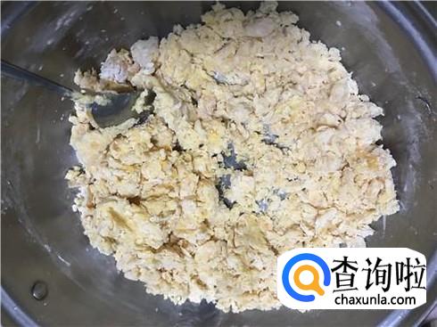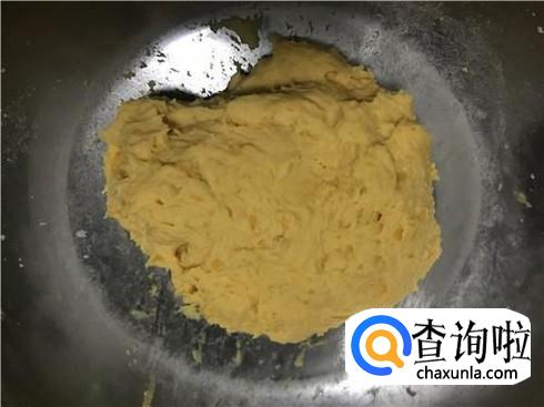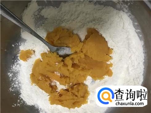 和面。取适量的面粉,加入制作好的地瓜泥,然后用勺子稍微搅拌一下,可以加入适量的盐,这样能让面更加有味道。将地瓜泥和面粉充分搅拌以后,会呈现出图3的样子,一般不需要放水,因为地瓜中水分很充足。