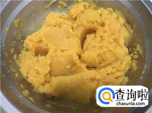 制作地瓜泥。先将地瓜切成薄片,然后放在蒸锅上蒸几分钟,切得越薄越快蒸熟。然后放凉来,接着用勺子将地瓜捣碎,如图所示,变成地瓜泥,这样就能用地瓜泥来制作地瓜面条了。