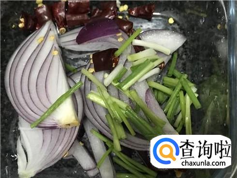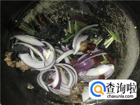 炒佐料。热锅放油,将五花肉煸炒至香,然后加入适量的洋葱、青葱,这样更能让五花肉更有味道,火候不宜过大,小火慢炒,至到出来香味即可。