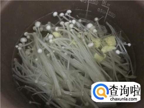 锅中烧清汤。锅中加入水,然后放点自己想吃的菜来做成清汤,这样烫面更美味,这里用来金针菇,味道是非常不错的。