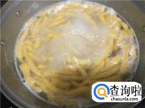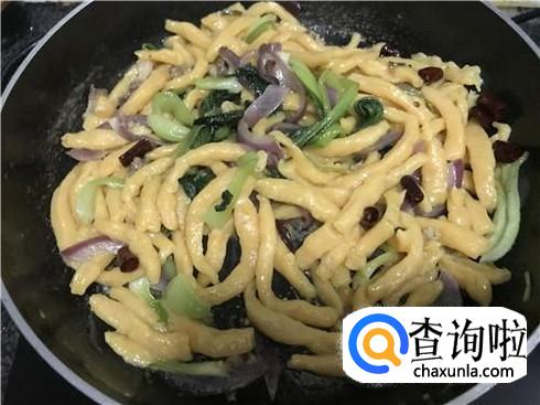 下面。接着另起一个锅,放入适量的清水,然后烧至沸腾,然后将做好的地瓜面一一放入锅中,转小火,否则有的面很容易就熟了,熟太透也不是非常好的。当锅中面条都熟了以后,将面捞到刚才炒的青菜中,稍微搅拌一下。