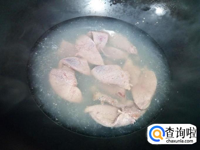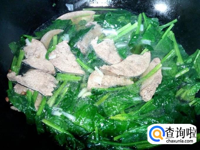 水开后,放入沥干水分的猪肝。再开锅后,放入菠菜。