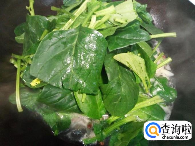 煮至菠菜变软,放入味精关火。滴少许芝麻油,出勺。