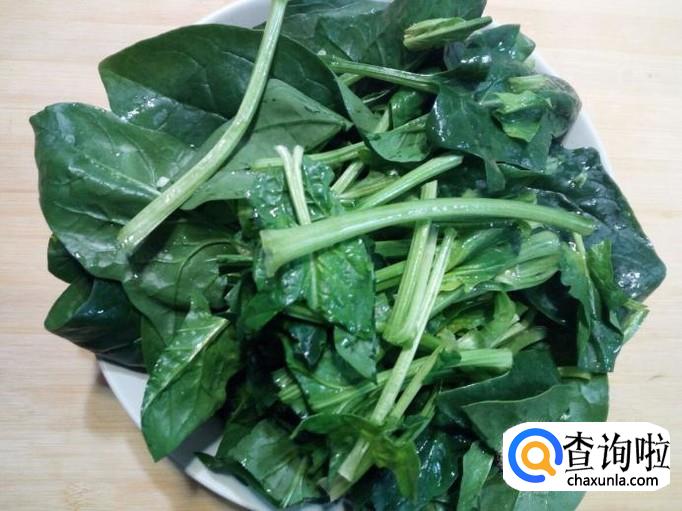 菠菜收拾清洗干净,控干水分,用刀切成对半。