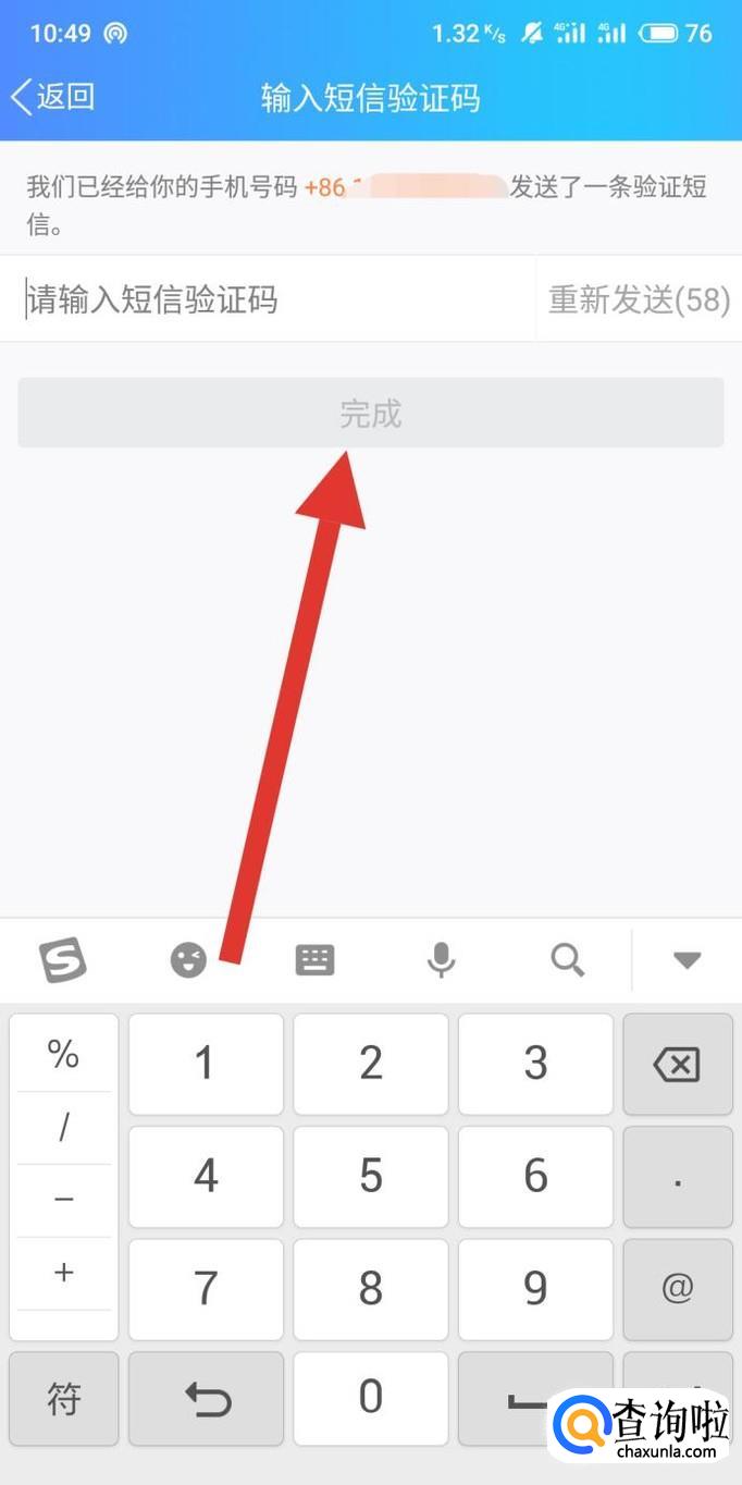 进入之后,填写手机收到的验证码,点击“完成”即可。
