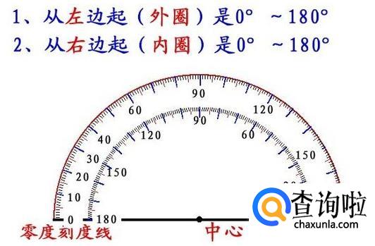 在使用量角器之前我们需要认识量角器,量角器一般都是半圆形的,半圆所在的直径就是量角器的零刻度线,直径所在的中心位置就是量角器的中心(对于量角很重要的一个位置),半圆上的刻度就是用于量角的度数,范围是0到180度。