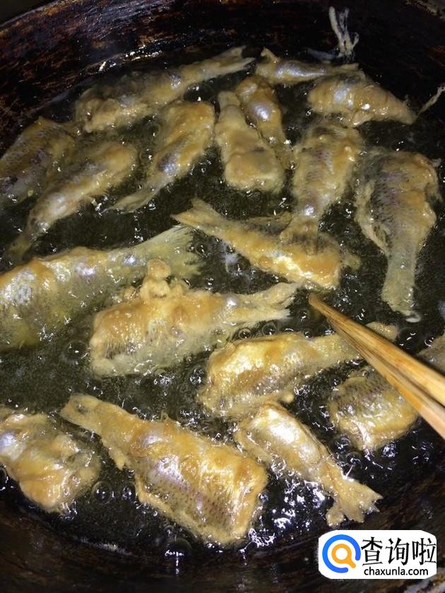 接着我们需要把腌制好的小鱼裹上面粉放入油锅里面短暂的炸一下,炸制小鱼两面金黄后捞出备用。