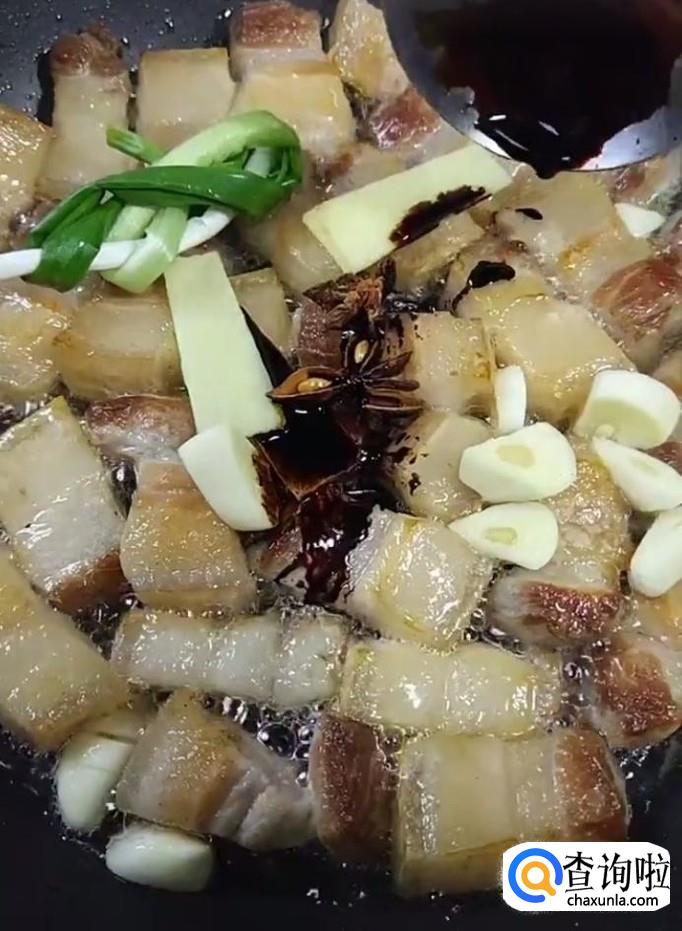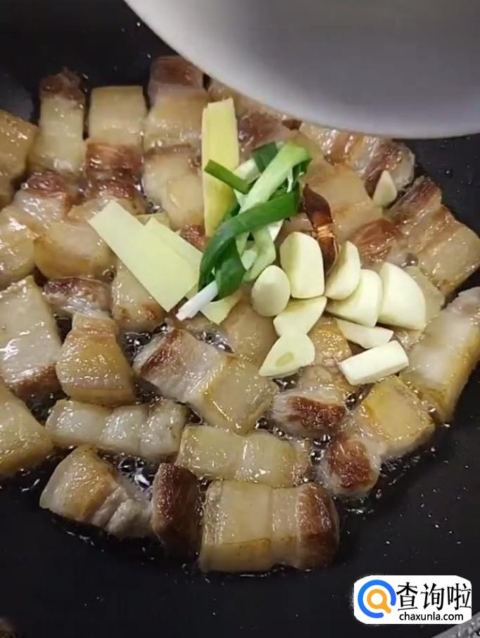 然后我们将煮好的五花肉放入一个干净的锅中,煎出油,放入葱姜,八角,蒜,炒出香味