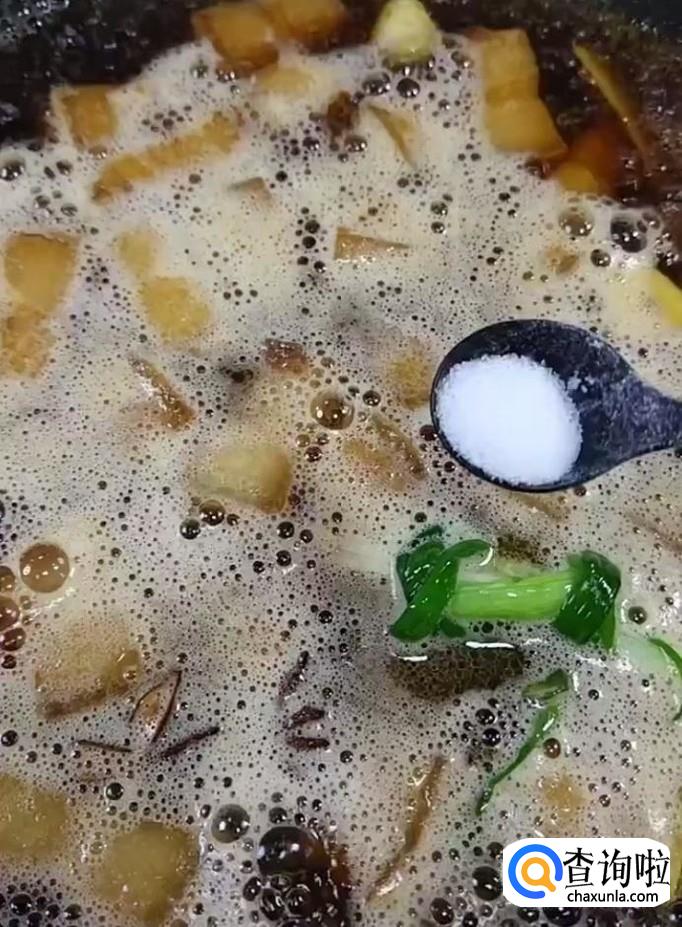 然后我们倒入适量的清水,一罐啤酒,再放入适量的盐,开小火炖20分钟
