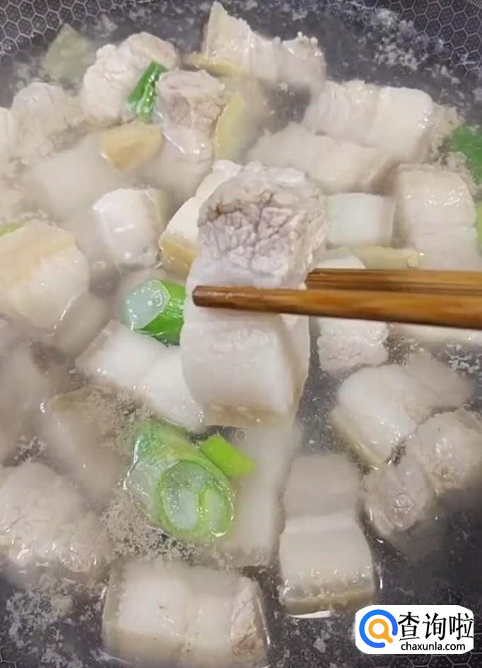 接着我们在锅中倒入适量的凉水,倒入切好的五花肉,放入葱姜,料酒,煮五分钟捞出控干水分