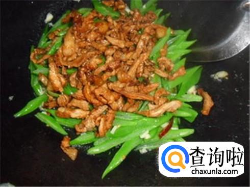 刀豆放进去和肉一同翻炒,喜欢吃辣的朋友放一些红辣椒进去,翻炒过程中可以适当加一点点水防止糊锅,炒好之后用食盐和一点味素调味出锅。