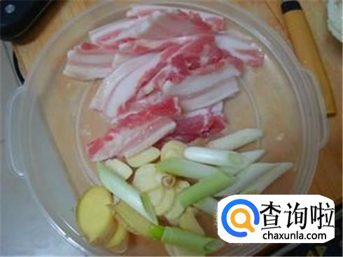 偏瘦的五花肉清洗干净切片,再准备一些生姜和小葱,喜欢吃辣的朋友可以准备几个干红辣椒。