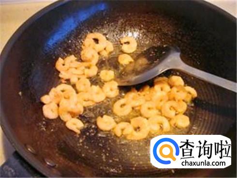 炒好鸡蛋碎之后立刻装进盘子里,重新倒一点点油烧热,下入虾仁、胡萝卜丁、葱花快速翻炒,这时候要用小火,且不要加水。